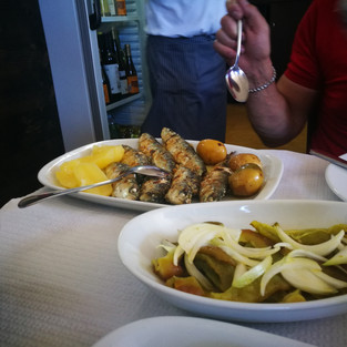 De seguida, chegaram as entradas, compostas por salada de polvo, "punheta" de bacalhau e azeitonas com oregãos embebidas em azeite. Qualidade acima da média ao nível das entradas. Após uma pequena conversa meia dúzia de fotos para o blog, fizemos então o pedido, que foi uma dose de lulas grelhadas para mim e uma dose de sardinhas assadas para o meu irmão, para que desta forma pudéssemos desfrutar de ambos os menus.